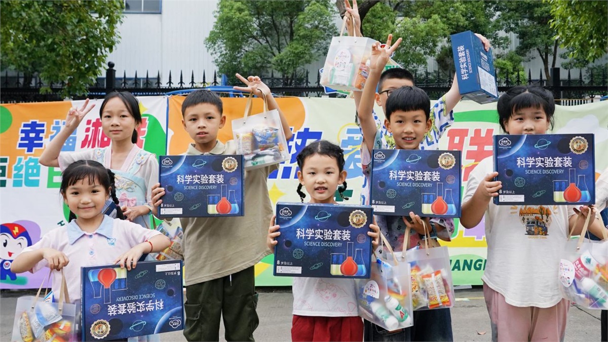 運動會后,小朋友們在“湘聯寶貝歡樂集市”領取了零食禮包和科普實驗套裝,孩子們捧著禮物,臉上洋溢著滿足與幸福。